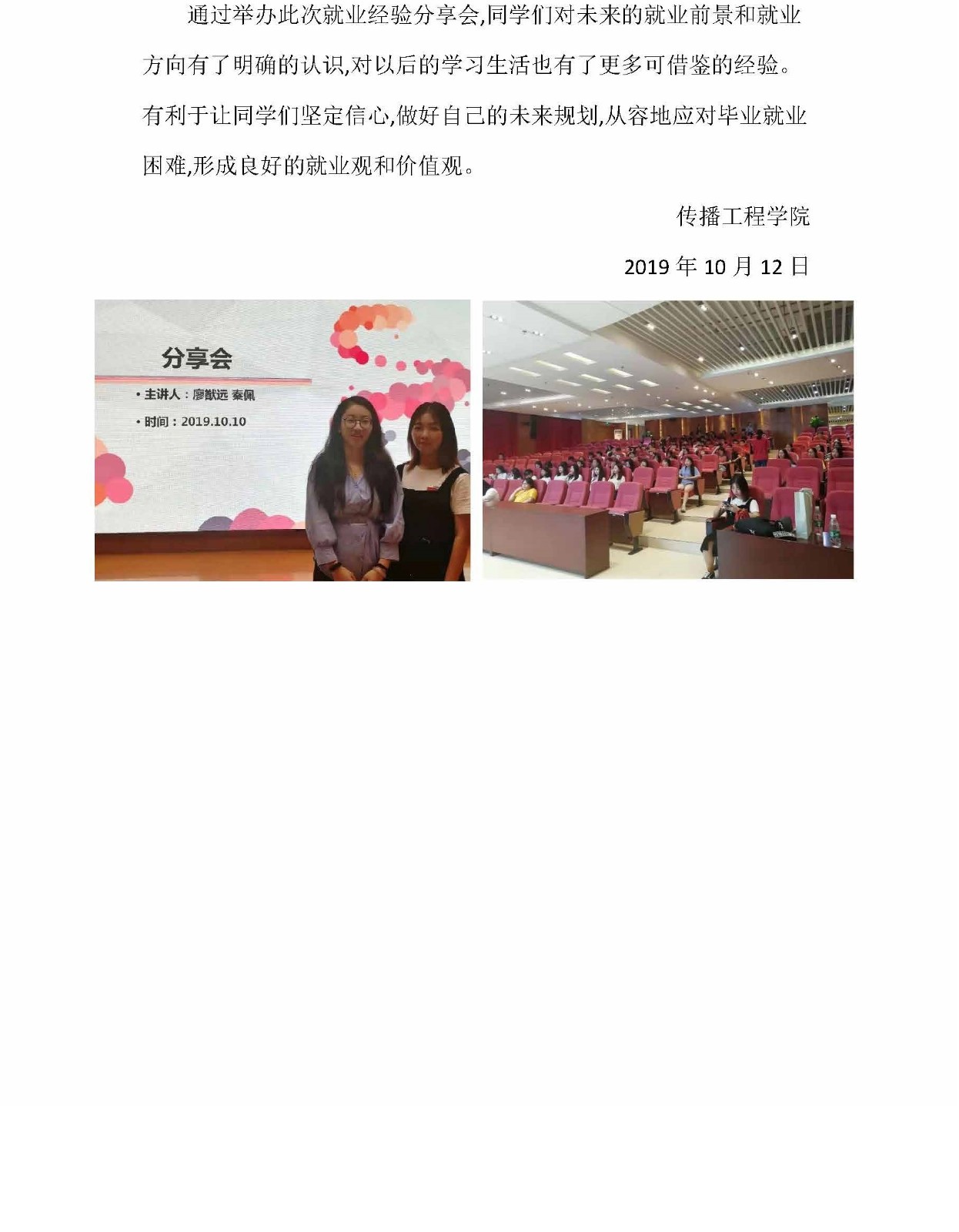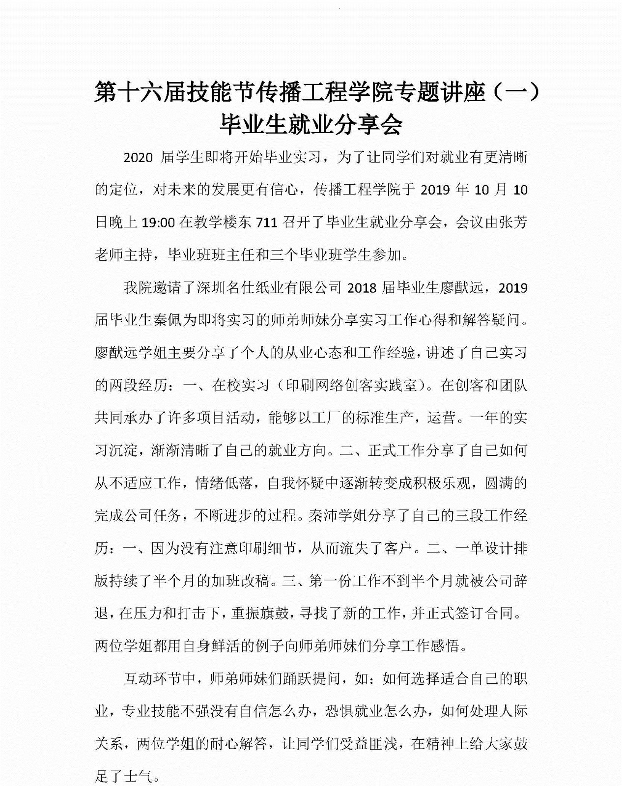 第十六届技能节传播工程学院专题讲座(一)毕业生就业分享会